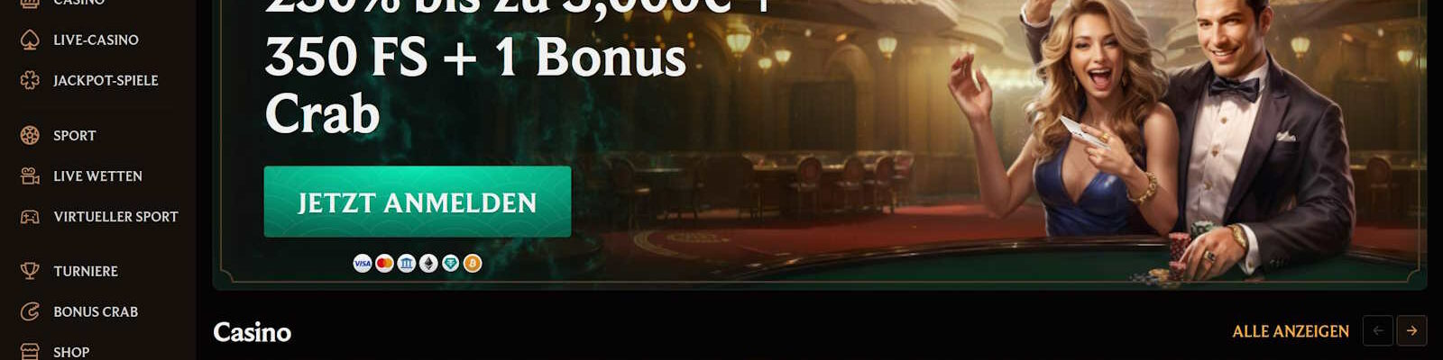 | Willkommensbonus | bis zu 3000€ + 350 Freispiele + Bonus Crab |